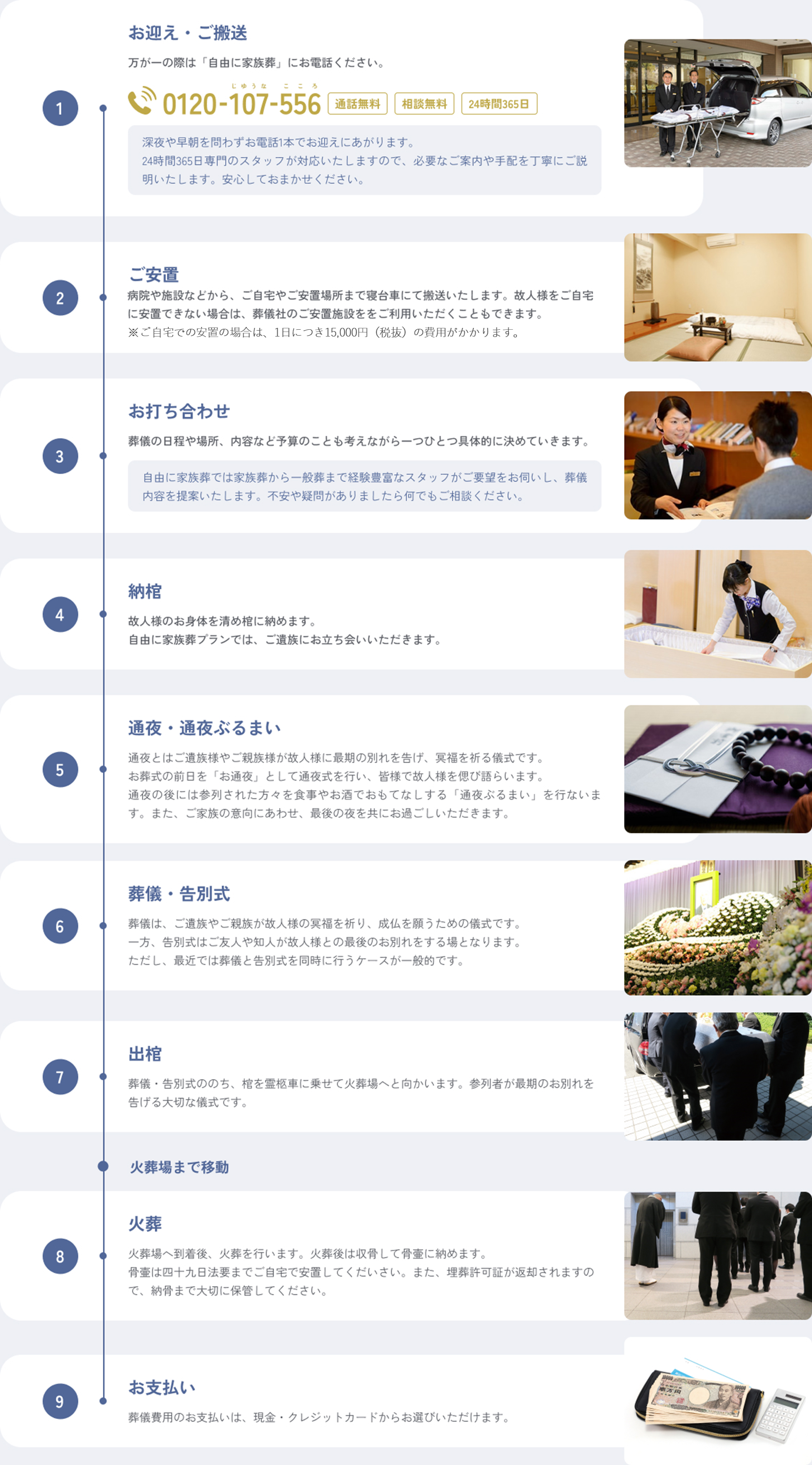 | 霊柩出棺 | 国産寝台霊柩 安置場所~火葬場まで:20km |