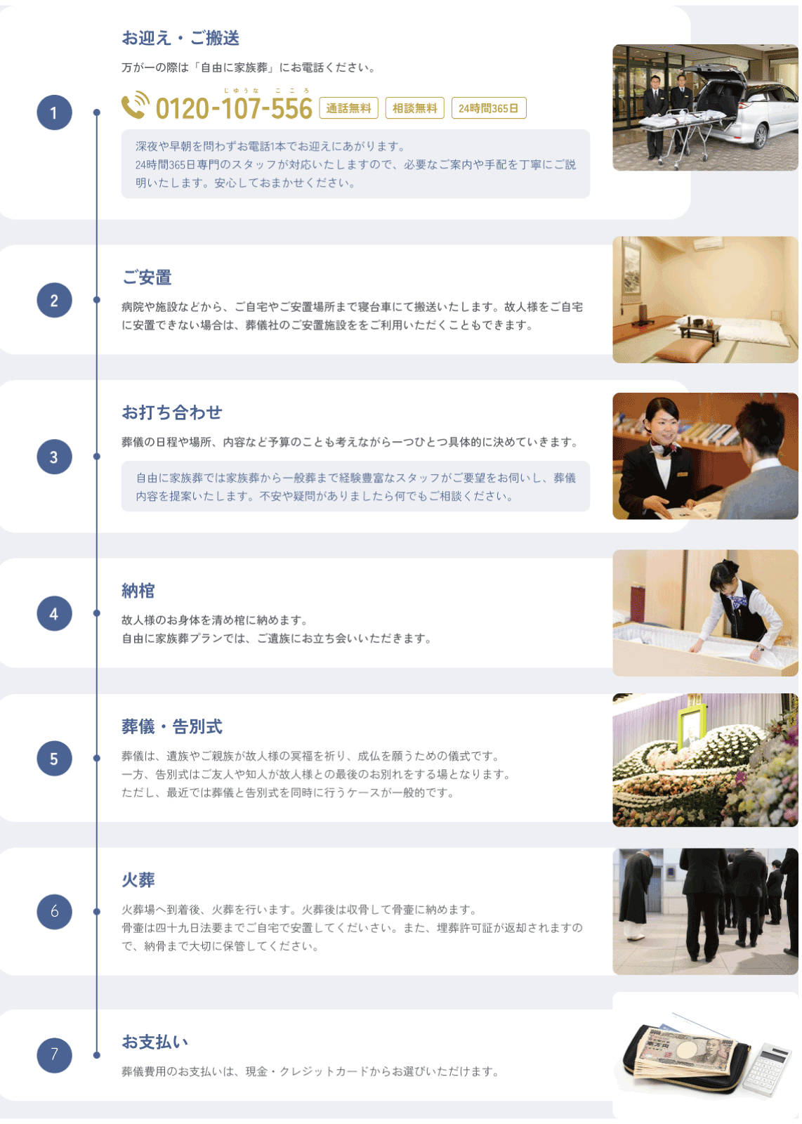 | 寝台搬送 | お迎え~安置場所: 1回20kmまで、安置所~火葬場: 1回20kmまでの計2回 |