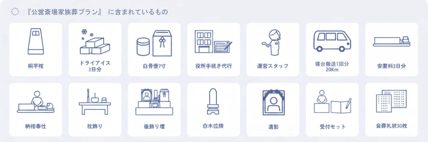 お葬式に必要なものが含まれているお得なプラン 公営斎場家族葬プラン |